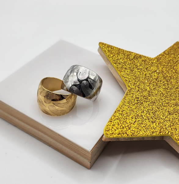 Anello a fascia larga con incisioni geometriche astratte per un effetto dinamico, quasi ipnotico. Dal design moderno e grintoso, perfetti da indossare singolarmente per un look deciso o abbinato per un contrasto raffinato.