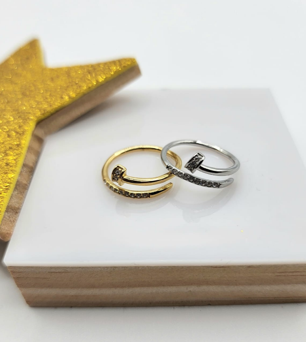 Anello a forma di chiodo impreziosito da brillantini che avvolge il dito con un'eleganza ribelle.