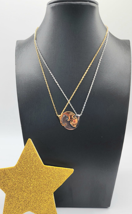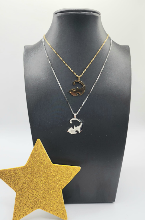 Due metΓ in oro e argento, che si completano. Queste collane con pendente a forma di gatto che unite si intrecciano, pensate per essere indossate insieme o divise tra due persone speciali che, anche seΒ lontane,Β vogliono sentirsi sempre vicine, legate da da un simbolo di unione, affetto e complicitΓ .. con un tocco felino!