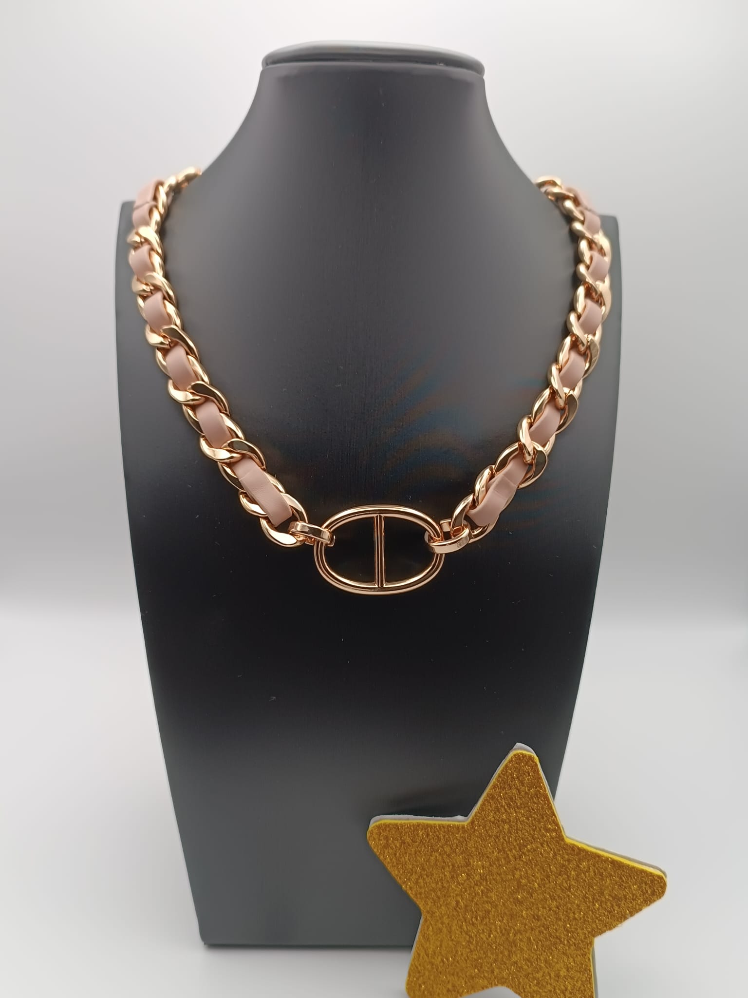Collana girocollo Groumette colore oro con intreccio in pelle rosa ed inserto ovale.