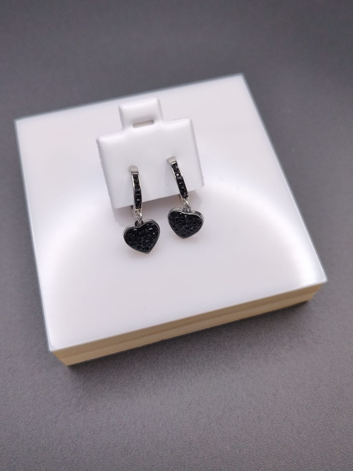 Coppia di orecchiniΒ a cerchio con pendenti a cuore impreziositi da brillantini neri e bordati in argento.
