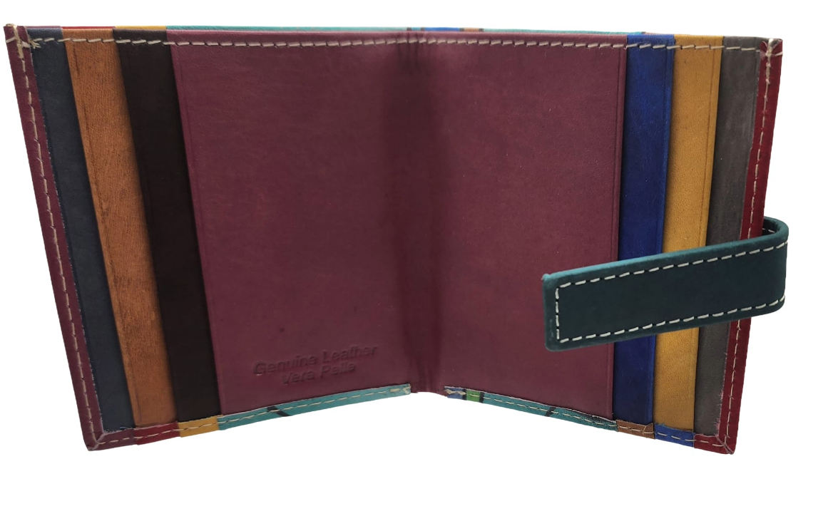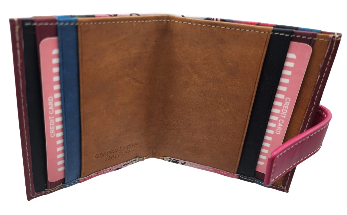 Con 12 scomparti multicolor per carte e tasca per contanti, chiusura a bottone.
