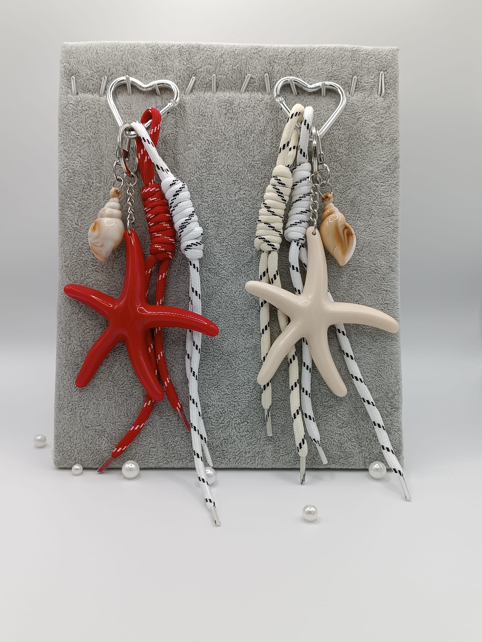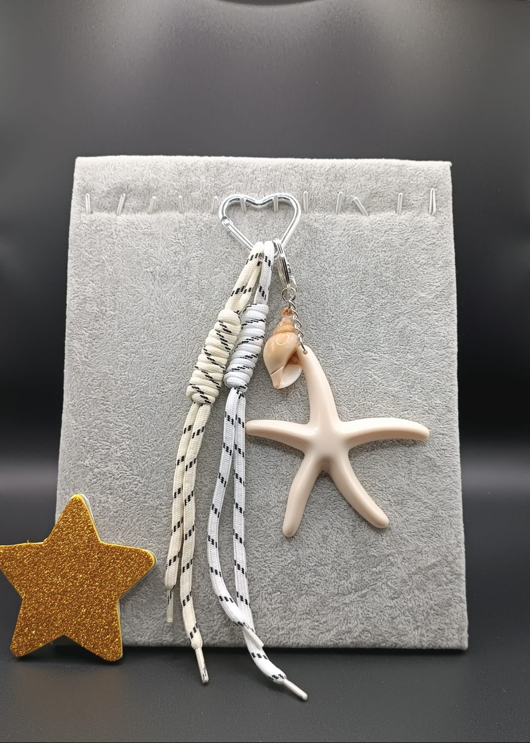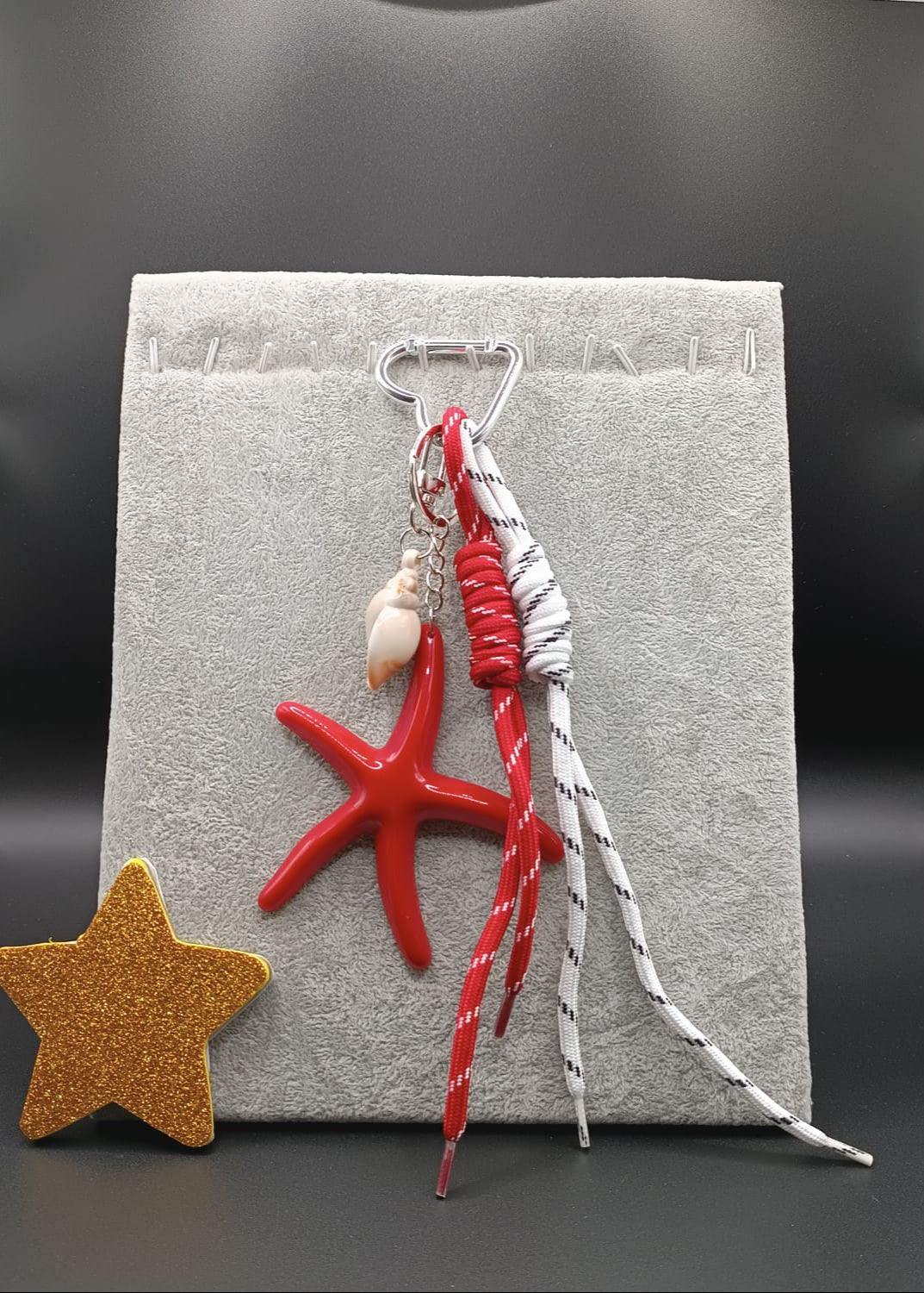 Portachiavi o charm per borsa stella marina in plastica, con inserti in cotone e plastica, moschettoni in metallo.