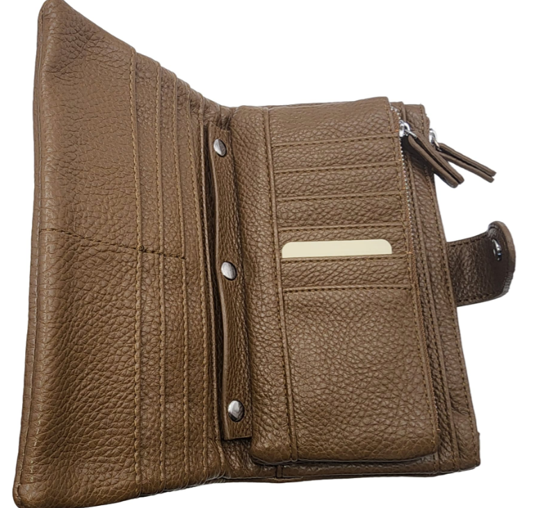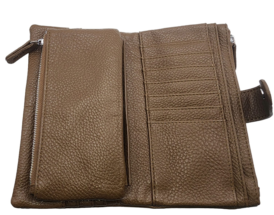 Tanti scomparti per tessere, diverse tasche, portamonete staccabile e una tasca con cerniera.