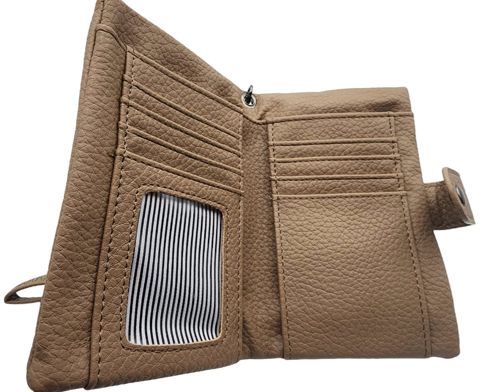 Tanti scomparti per tessere, diverse tasche, portamonete separabile e una tasca con cerniera esterna, dispone di un laccetto staccabile per poterlo anche tenere al polso.