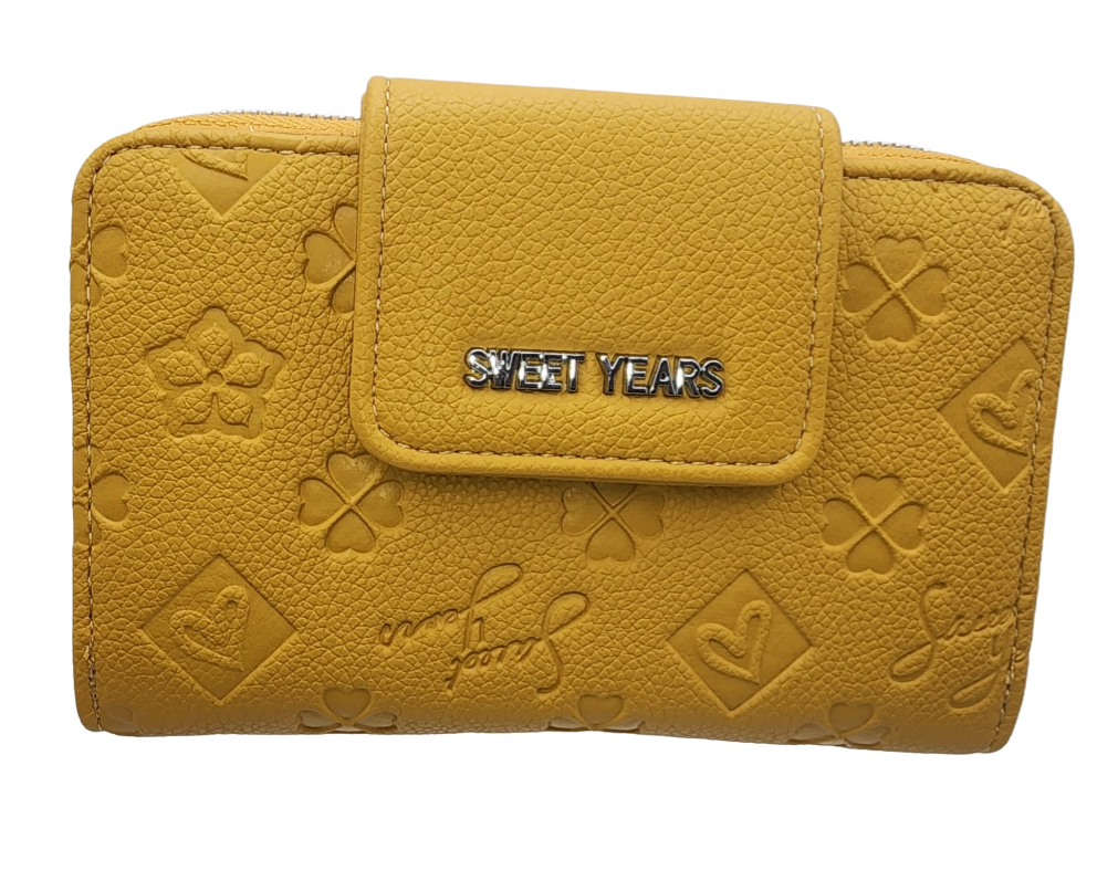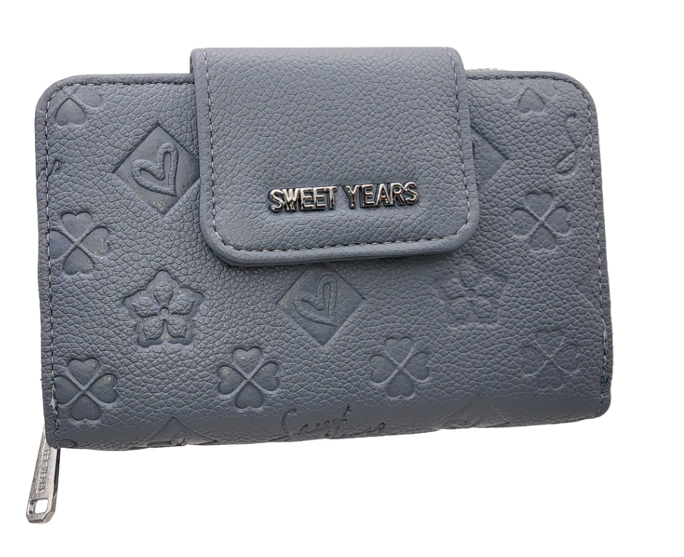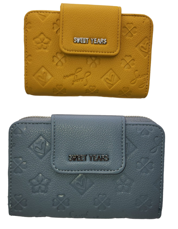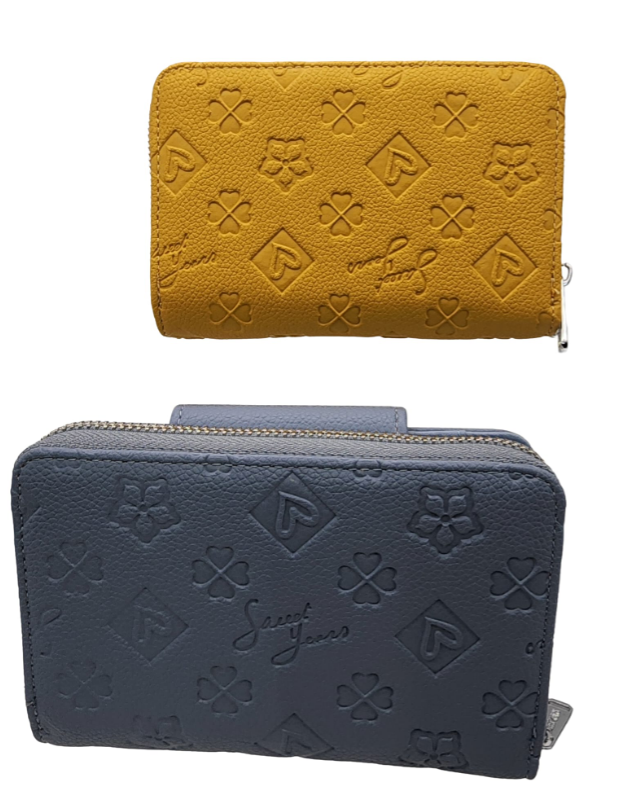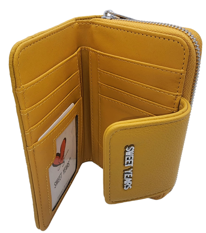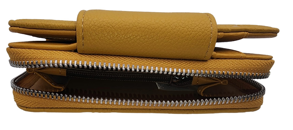 Portafoglio conΒ uno scomparto con cerniera per monete e documenti e uno scomparto con bottone per tessere e contanti.