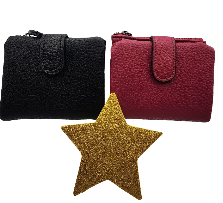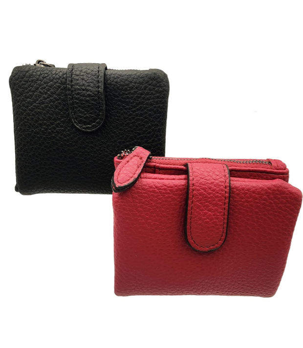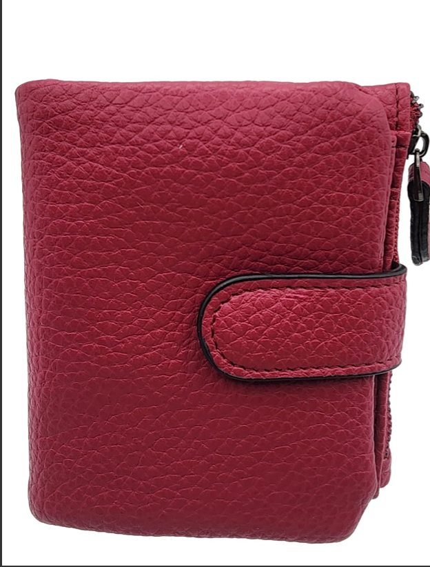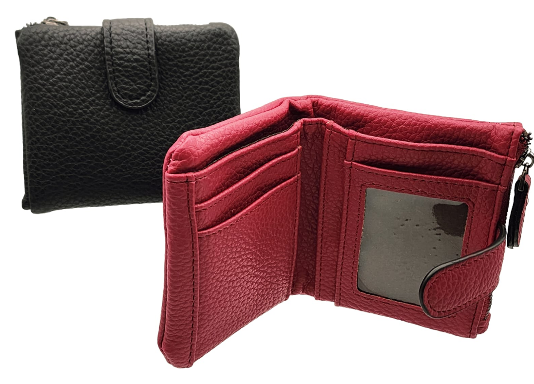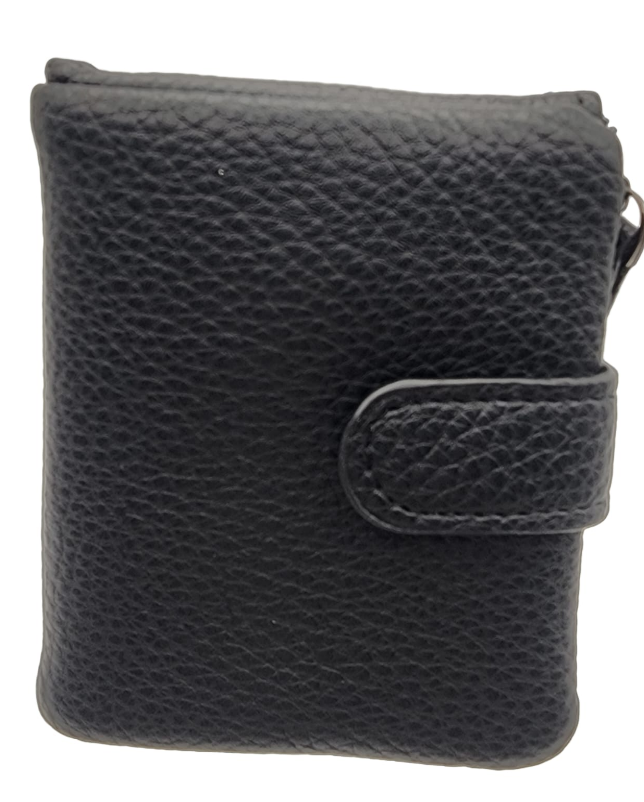 Portafoglio con apertura con bottone, spazio per carte e banconote, una tasca con cerniera per le monete.