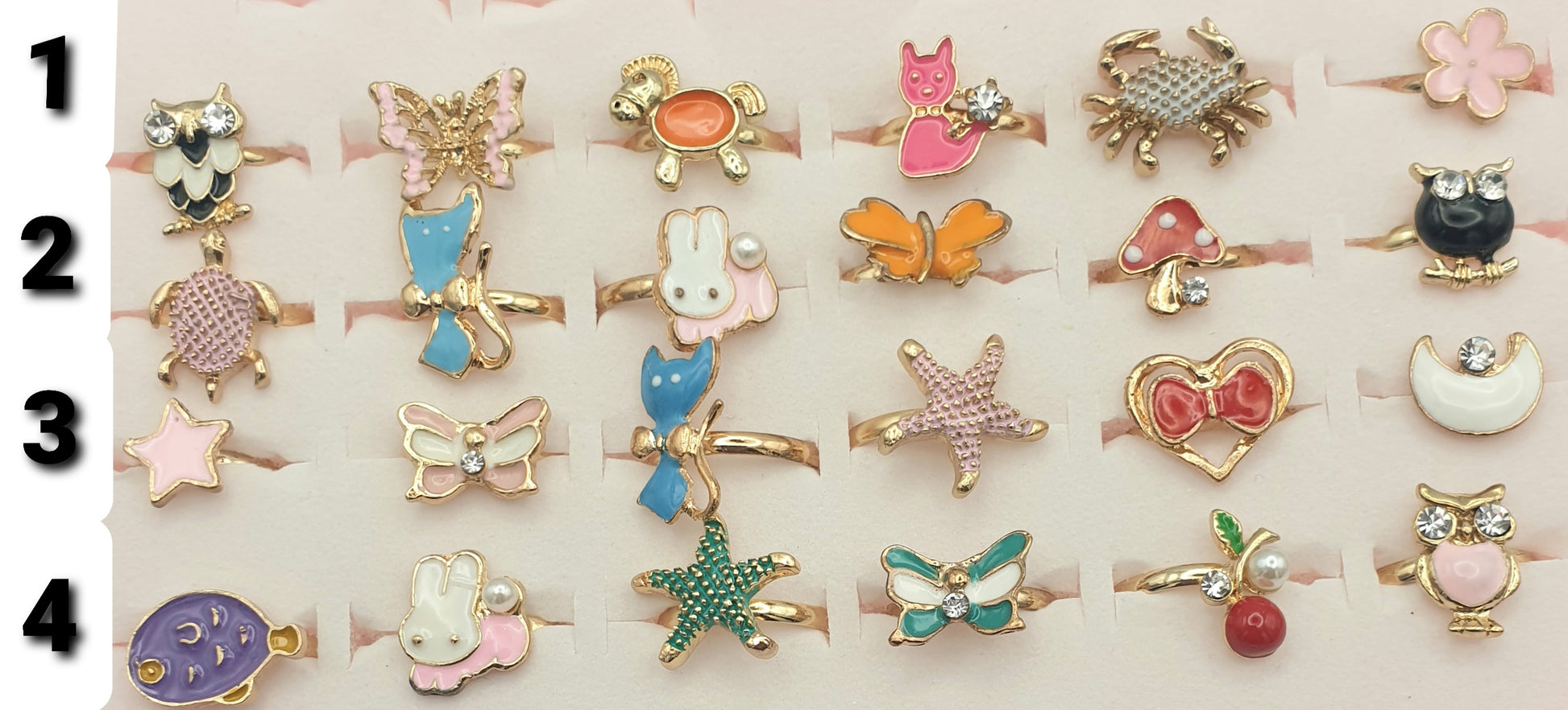 Set composto da 6 anellini in metallo regolabili, smaltati e con brillantini.