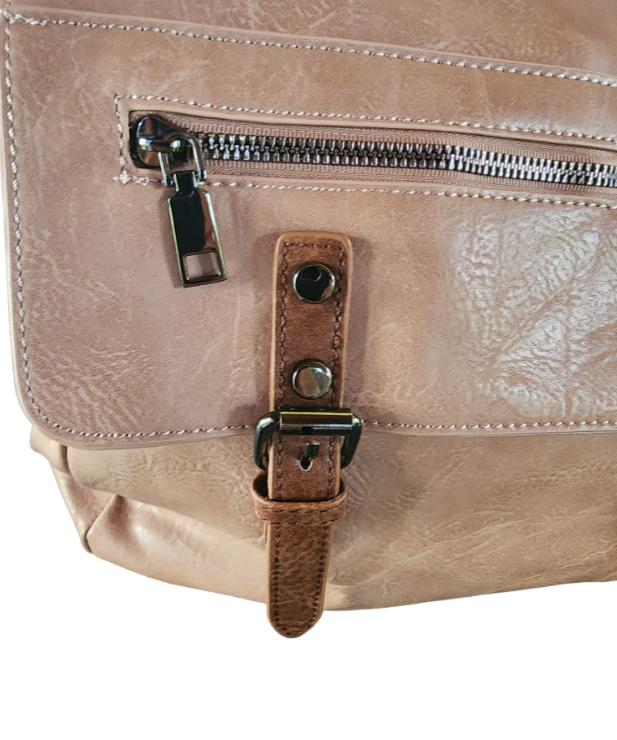 Chiusura principale con dueΒ bottoni calamitati nascosti da fibbie, apertura con zip, internamente divisorio cernierato e tre tasche. Una tascaΒ frontale con cerniera e una posteriore. Manico comodo per portarlo anche a mano.